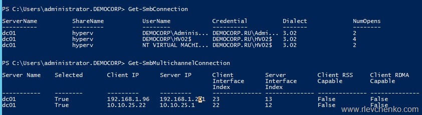 PS C:\Users\administrator.DEMOCORP> Get-SmbMultichannelConnection