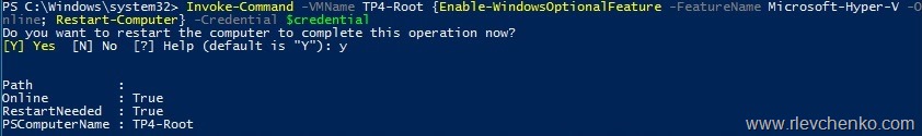 Invoke-Command -VMName TP4-Root { Enable-WindowsOptionalFeature -FeatureName Microsoft-Hyper-V -Online; Restart-Computer} -Credential $credential
