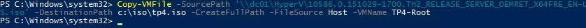 Copy-VMFile -SourcePath "unc or local path to ISO" -DestinationPath c:\iso\nameofiso.iso -CreateFullPath -FileSource Host -VMName TP4-Root