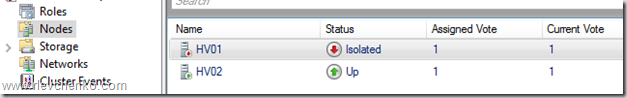 It’s allowed to HV01 be in Isolated state within ResiliencyDefaultPeriod (240 seconds by default). But if the cluster service (in my case) is not in online state after 240 seconds, HV01 host will go into a down state and VMS will be migrated to the “health” node.