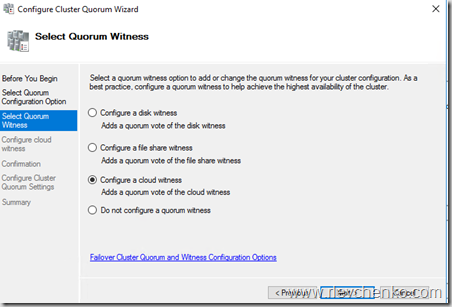 2) Run Quorum Configuration on your cluster and choose “Select the Quorum Witness – Configure a Cloud Witness”