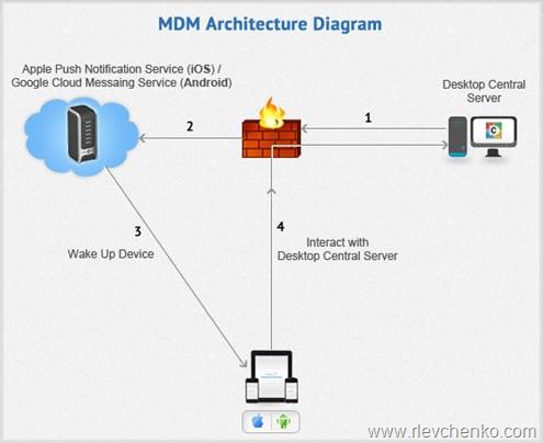 - Any communication from Desktop Central to the device is routed through Apple Push Notification service (APNs) via TCP port 2195 for iOS devices and through GCM via TCP port 80 for Android Devices