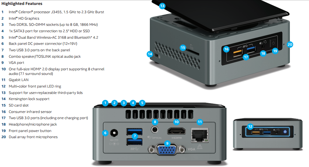 NUC is completely fanless and noiseless (except of Skull Canyon NUC series which is oriented to gamers). Some of NUC kits can also be shipped with the pre-installed SSD and memory. List of currently available kits is here .