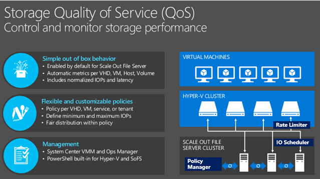 Storage QoS in the upcoming Windows Server 2016 provides a way to centrally monitor and manage storage performance for virtual machines. The feature automatically improves storage resource fairness between multiple virtual machines using the same file server cluster. In other words , QoS for Storage will be distributed between group of virtual machines and virtual hard disks.